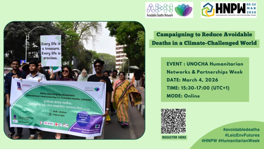 The Avoidable Deaths Network is excited to announce its participation in the 2026 UNOCHA Humanitarian Networks and Partnerships Week (HNPW), where it will host two online sessions featuring selected experts and outstanding speakers. These sessions will take place from 03 to 04 March 2025, focusing on key issues in disaster risk reduction.